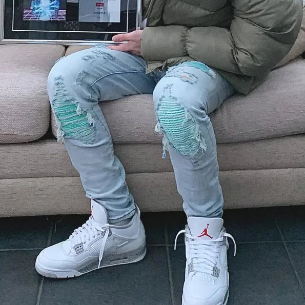 Baby Blue Water Worn Patch Torn Jeans for Men